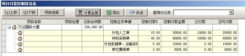 2. 假設(shè)【萬(wàn)達(dá)國(guó)際大廈】項(xiàng)目,承包合同中累計(jì)收款金額為20萬(wàn),那么按控制比例得出的結(jié)果是:人工費(fèi)=200000*15%=30000、材料費(fèi)=2000000*45%=90000、外包機(jī)械運(yùn)輸車輛=10000、其他費(fèi)=6000,具體資金狀況我們可以在菜單二次開(kāi)發(fā)中打開(kāi)【項(xiàng)目資金控制狀況表】查看,其中包含了項(xiàng)目控制付款金額(根據(jù)上面的公式得出),已付款金額(根據(jù)累計(jì)付款單得出),還可付款(根據(jù)上面兩組數(shù)據(jù)得出)。