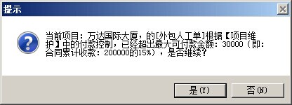 3. 超控制金額付款預(yù)警提示。在新建、審核付款申請(qǐng)單操作時(shí),如果付款申請(qǐng)金額超過(guò)還可付款金額,都會(huì)彈出相應(yīng)提示。我們以外包人工單為例,上圖所示還可付款金額為20000,我們做一張付款申請(qǐng)單,如果我們付款金額為30000,那么在單據(jù)保存和單據(jù)審核時(shí),都會(huì)彈出以下的提示: