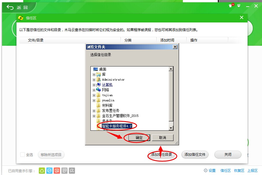 點擊添加信任目錄,找到加密鎖服務程序文件夾,選中然后點擊確定