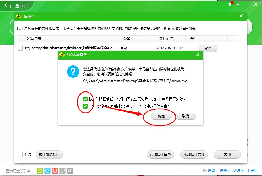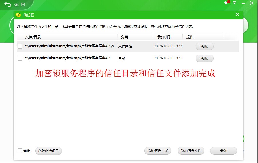 信任目錄添加完成,然后點擊添加信任文件,找到加密鎖服務程序文件夾打開,找到