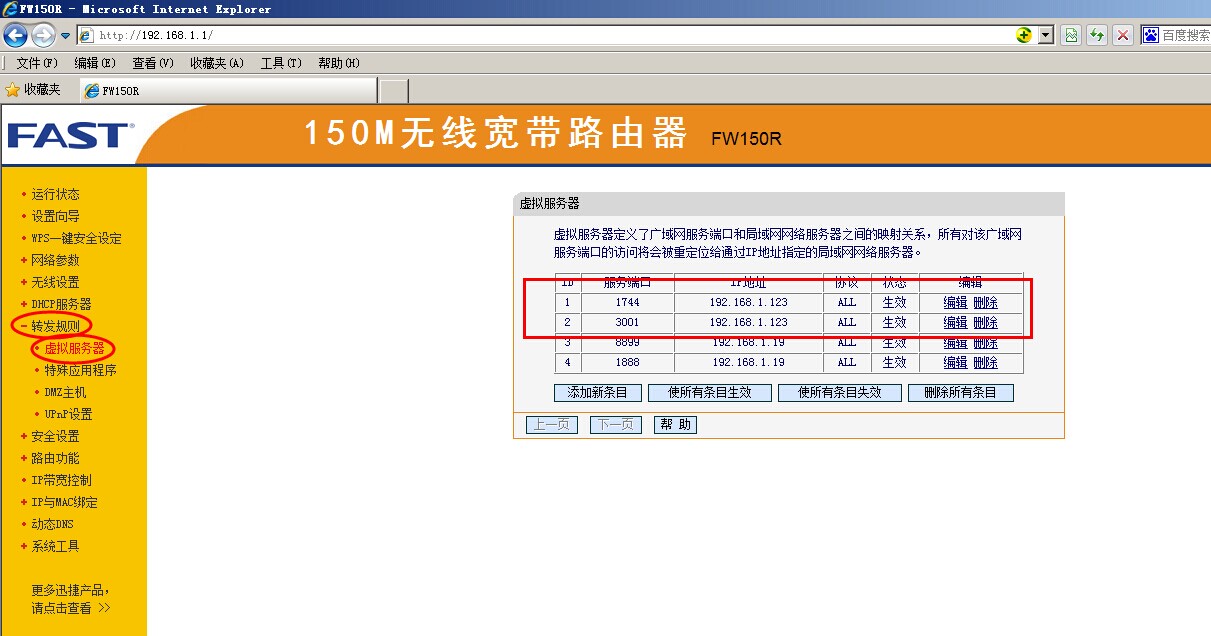 進入路由器,找到轉發(fā)規(guī)則(路由器型號不同,名稱有差異)分類中的虛擬服務器,會顯示金石軟件兩個端口1744(軟件)和3001(加密鎖)的映射。