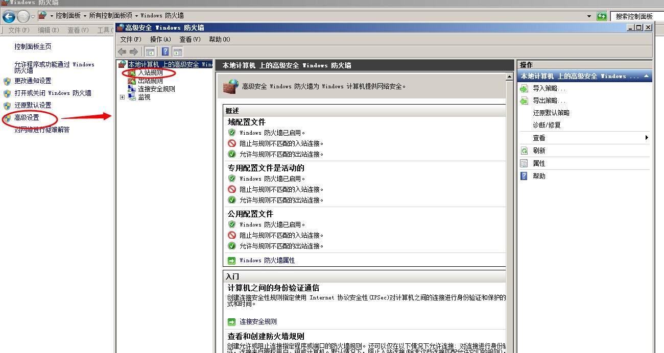 彈出Windows防火墻窗口,點高級設置,彈出高級安全Windows防火墻窗口