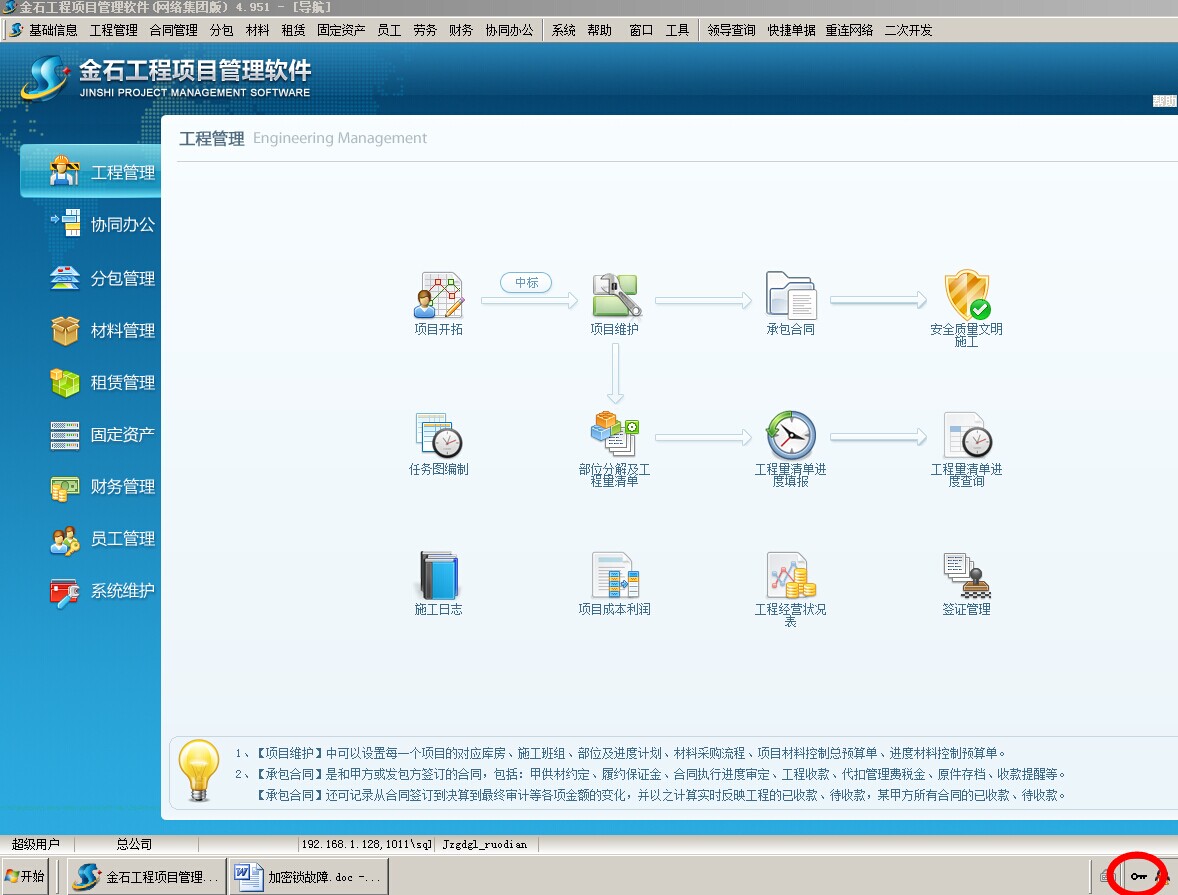 ② 如服務器插有加密鎖,則檢查加密鎖的服務程序是否開啟,到服務器電腦桌面右下角的任務欄是否啟動了加密鎖服務程序