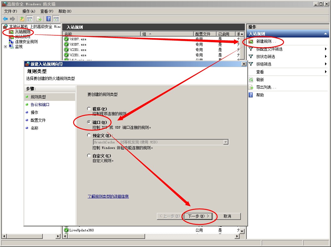 點入站規(guī)則----新建規(guī)則,在彈出的新建入站規(guī)則向導窗口中選端口項,點下一步