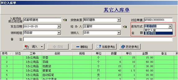 1. 【其他入庫單】一般用在期初庫存輸入或材料來源不牽扯應(yīng)付賬款的情況。在填寫其他入庫單時進(jìn)場方式選擇:直進(jìn)項目,那么單據(jù)明細(xì)中材料的金額會直接進(jìn)入單據(jù)所選擇的項目成本中。如果選擇了其他入庫,那么這批材料的金額不會直接反映到項目成本中,這批材料必須出庫后才會進(jìn)入項目成本(這批材料的成本以出庫時所填寫單據(jù)中的金額為準(zhǔn))。