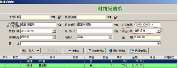 2. 【材料采購單】也稱為:材料驗收單、材料入庫單,是材料采購時,材料到達(dá)現(xiàn)場后要填寫的單據(jù)。在單據(jù)填寫時進(jìn)場方式分為:采購入庫和直進(jìn)項目。與其他入庫單相同,進(jìn)場方式選擇直進(jìn)項目時,明細(xì)中的材料金額會直接進(jìn)入單據(jù)所選的項目成本中。