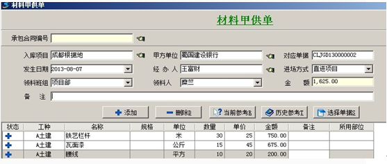 1. 【材料甲供單】這張單據(jù),是在甲供材料入場時填寫的業(yè)務(wù)單據(jù),填寫單據(jù)時,進(jìn)場方式選擇直進(jìn)項目,則該批材料會直接進(jìn)入項目甲供成本。