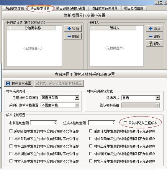 (二)、甲供材料,是項目所用材料由甲方公司提供。在默認(rèn)情況下甲供材不會統(tǒng)計入項目成本,如果用戶希望甲供材統(tǒng)計入項目成本,必須在項目維護(hù)中把相關(guān)開關(guān)打開,如下圖: