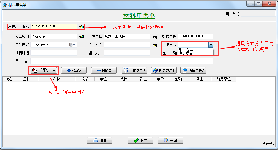 點(diǎn)擊主菜單【材料】->【材料甲供單】->【新建】打開(kāi) 新建【材料甲供單】窗口 界面如下: