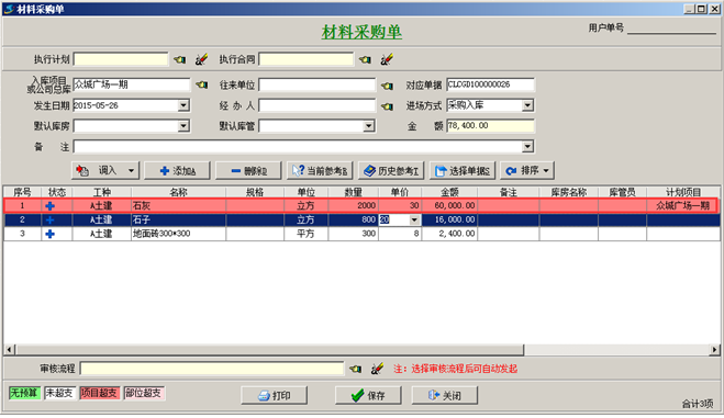 第二步,工程項(xiàng)目材料預(yù)算綁定好之后,在進(jìn)行材料采購(gòu)的時(shí)候可根據(jù)預(yù)算調(diào)入采購(gòu)材料。如果采購(gòu)量超出預(yù)算量,系統(tǒng)會(huì)給出對(duì)應(yīng)的預(yù)警提示,如圖: