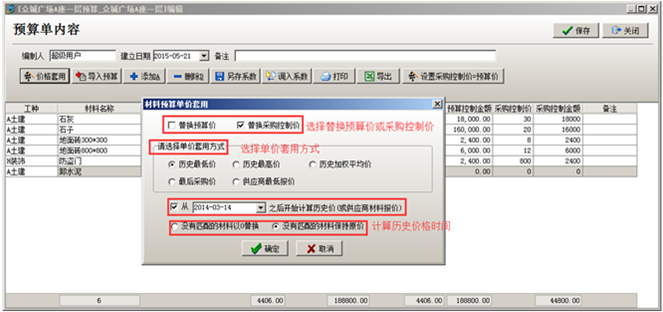 在進(jìn)行材料預(yù)算編輯時(shí),工程項(xiàng)目材料預(yù)算的單價(jià)可套用歷史采購(gòu)價(jià)價(jià)格。點(diǎn)擊“價(jià)格套用”,選擇好替換“預(yù)算價(jià)”或“采購(gòu)控制價(jià)”,選擇單價(jià)套用方式,以及沒有對(duì)應(yīng)材料時(shí)的替換方式,替換完成之后點(diǎn)擊確定,系統(tǒng)按照選擇的條件將價(jià)格進(jìn)行替換。如圖:
