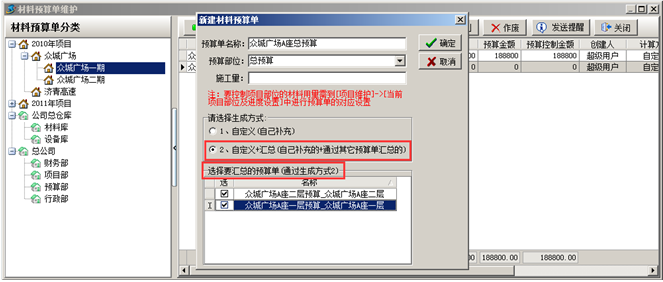 注:選擇第二種生成方式之后,在下面選擇匯總的預(yù)算單,確定之后會(huì)將選定的預(yù)算單內(nèi)容匯總到當(dāng)前預(yù)算單中。