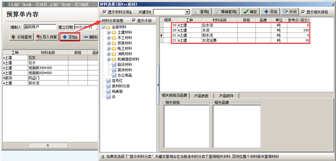 也可以點(diǎn)擊[添加]的按鈕,從材料庫(kù)中添加雨點(diǎn)材料到預(yù)算單中。點(diǎn)擊[添加]的按鈕,雙擊材料添加到預(yù)算單中,如圖: