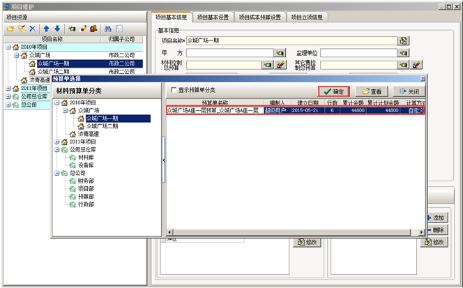 第一步,工程項(xiàng)目材料預(yù)算添加并保存完成之后,要將對(duì)應(yīng)的預(yù)算單與項(xiàng)目綁定對(duì)應(yīng)。進(jìn)入系統(tǒng)的【工程管理】模塊,點(diǎn)擊【項(xiàng)目維護(hù)】,選擇對(duì)應(yīng)的項(xiàng)目,點(diǎn)擊[編輯項(xiàng)目信息],點(diǎn)擊[選擇]的按鈕,選中對(duì)應(yīng)的預(yù)算單,點(diǎn)擊[確定]按鈕,預(yù)算單綁定到對(duì)應(yīng)的項(xiàng)目中。