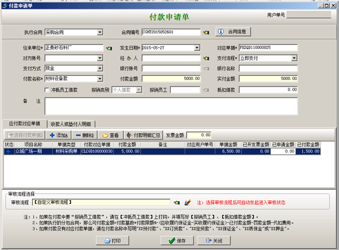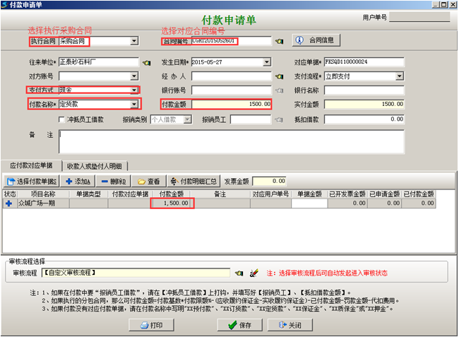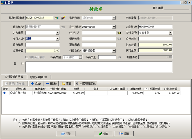 在工地現(xiàn)場(chǎng)材料管理過程中,如果工地現(xiàn)場(chǎng)采購大量材料需要簽訂采購合同并在到貨之前付預(yù)付款時(shí),我們要在采購合同中,選中對(duì)應(yīng)的采購合同,點(diǎn)擊[合同付款及相關(guān)發(fā)票],點(diǎn)擊[執(zhí)行付款]-[手工填寫]彈出“付款申請(qǐng)單”,在“付款申請(qǐng)單”中選擇執(zhí)行“采購合同”,并選擇對(duì)應(yīng)的“合同編號(hào)”,選擇“支付方式”,選擇“付款名稱”為“訂貨款”,并在“付款金額”里面輸入“預(yù)付款”金額,“付款申請(qǐng)單”添加完成之后點(diǎn)擊[保存]的按鈕保存單據(jù),如圖: