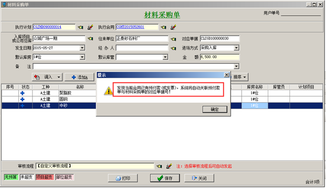 在工地現(xiàn)場(chǎng)材料管理過程中,材料到貨之后,可以做采購入庫單(材料驗(yàn)收單)執(zhí)行驗(yàn)收入庫(或直進(jìn)項(xiàng)目)。或在“合同內(nèi)容”里面,點(diǎn)擊[到貨驗(yàn)收],在彈出“采購入庫單”(材料驗(yàn)收單),在單據(jù)中輸入“驗(yàn)收數(shù)量”,保存時(shí)系統(tǒng)會(huì)提示自動(dòng)關(guān)聯(lián)第一次預(yù)付款,“確定”之后保存,如圖: