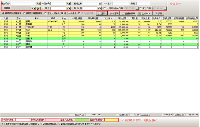 如果要查看材料采購的執(zhí)行情況,可進(jìn)入到[采購計(jì)劃執(zhí)行查詢]里面按照查詢條件進(jìn)行查詢。可根據(jù)材料顯示的不同的顏色看出材料的采購計(jì)劃執(zhí)行情況,如圖: