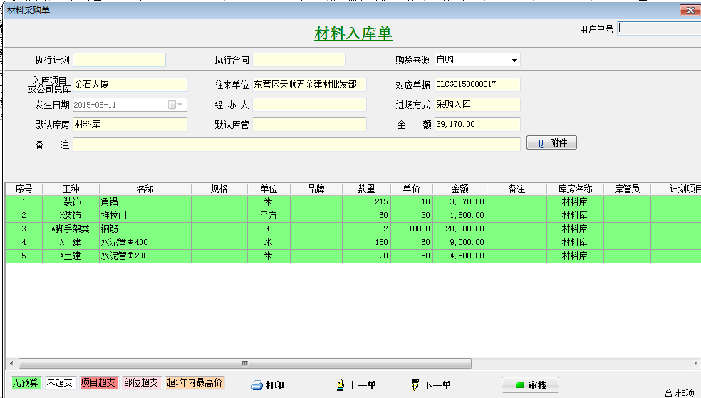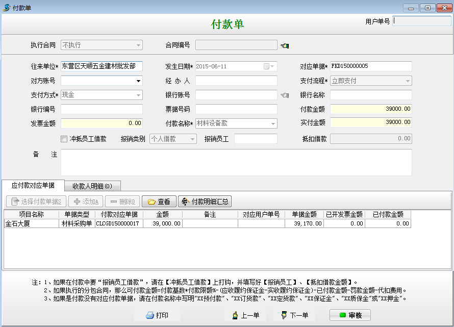 做一個(gè)總價(jià)金額39170材料采購(gòu)單,優(yōu)惠金額為170,實(shí)際付款金額為39000。如下圖