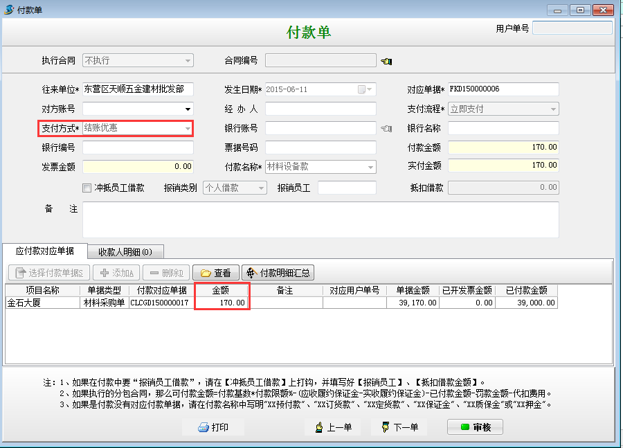 在工地項(xiàng)目管理系統(tǒng)中新建一個(gè)170的付款單,支付方式選擇結(jié)賬優(yōu)惠。如下圖
