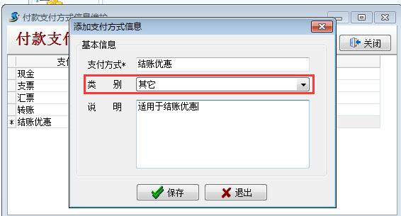 在工地項(xiàng)目管理系統(tǒng)中【財(cái)務(wù)管理】支付方式維護(hù)新建一個(gè)結(jié)賬優(yōu)惠的支付方式,類別選擇其它,如下圖