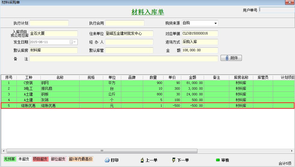 如果有優(yōu)惠金額時(shí),在工地項(xiàng)目管理系統(tǒng)中填寫采購(gòu)入庫(kù)單時(shí)添加這個(gè)結(jié)賬優(yōu)惠的虛擬材料,金額為優(yōu)惠金額的負(fù)數(shù)
