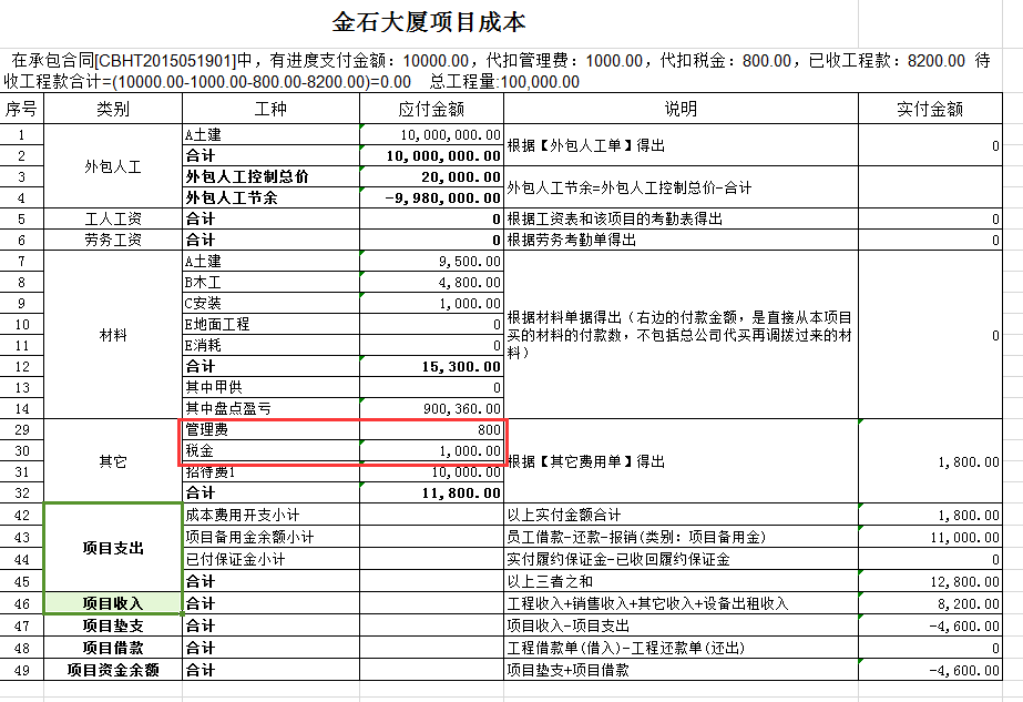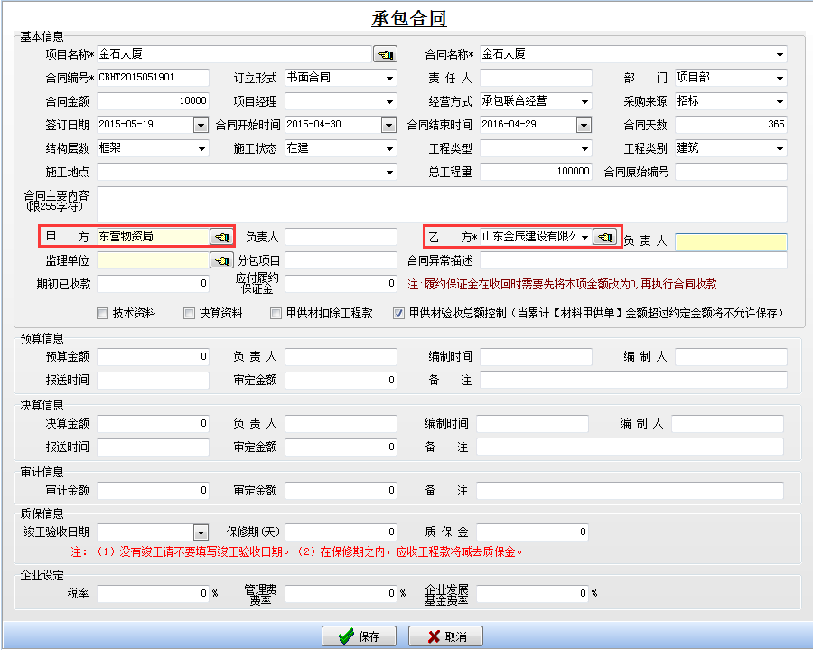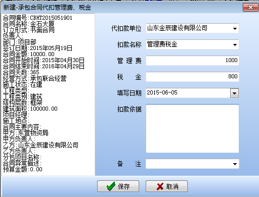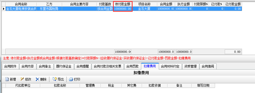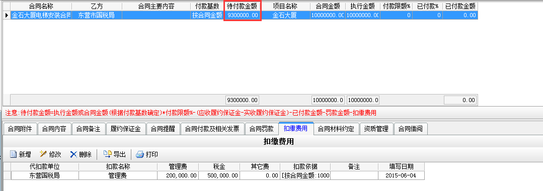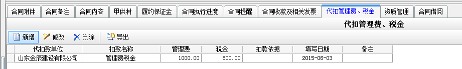 在工程項目資質(zhì)掛靠管理中因為借用乙方B的資質(zhì),需要扣除管理費,如果需要乙方B代開發(fā)票還需要扣除稅金。在承包合同中[代扣管理費稅金]模塊下操作,如下圖: