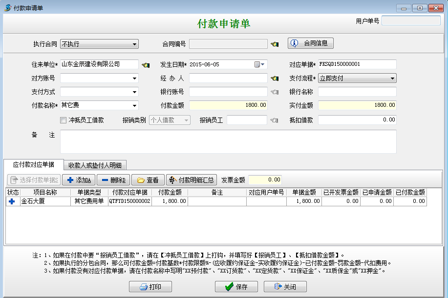 在工程項目資質(zhì)掛靠管理中因為借用乙方B的資質(zhì)或者乙方B代開發(fā)票需要向乙方B支付管理費和稅金。這時我們需要做其他費用單在做付款申請單或者付款單,具體操作如下:
