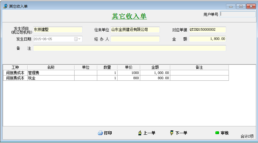在工程項目資質(zhì)掛靠管理中甲方直接把承包款支付給借資質(zhì)公司(乙方B),我公司不會跟甲方產(chǎn)生往來賬款。由于是借的我方的資質(zhì),乙方B需要向我公司支付管理費或者稅金。通過其它收入單來記錄這筆費用。如下圖: