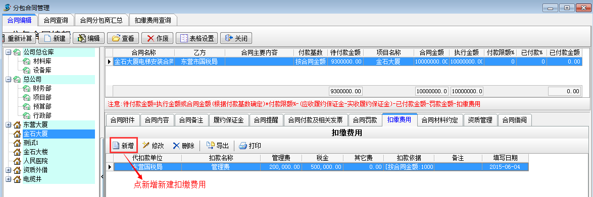 在工程項目資質(zhì)掛靠管理中乙方B借用乙方A的資質(zhì),乙方A需要扣除乙方B管理費,如果需要乙方A代開發(fā)票還需要扣除稅金。在分包合同中[扣繳費用]模塊下操作,如下圖: