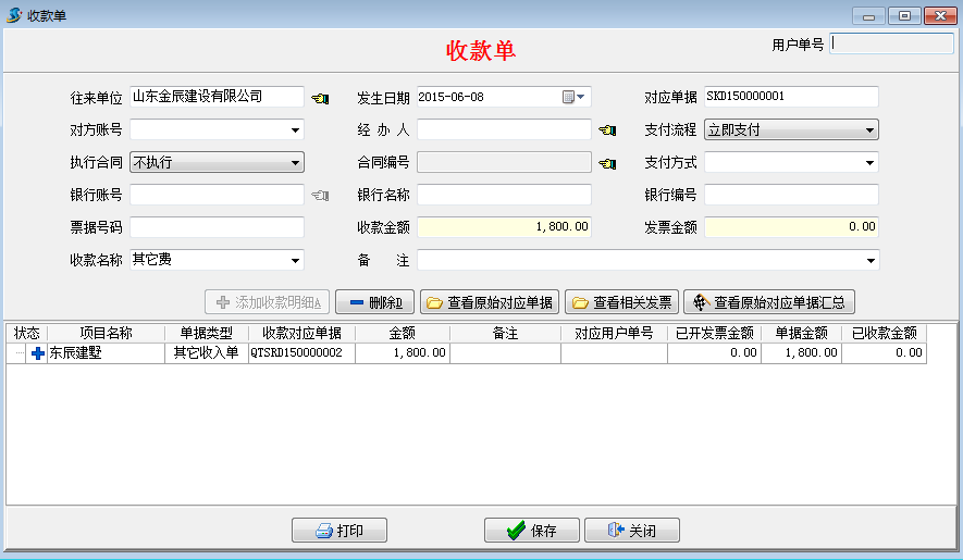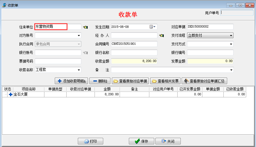 在工程項目資質(zhì)掛靠管理中如果收取工程款直接在[合同收款及相關(guān)發(fā)票]模塊填寫收款單,如下圖