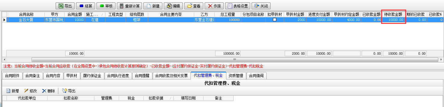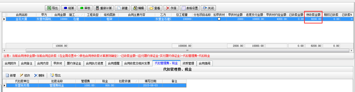 填寫完成【代扣管理費稅金】模塊時待收款金額
