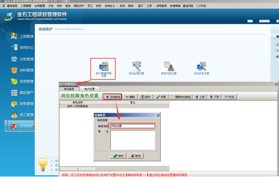 進入系統(tǒng)的“系統(tǒng)維護”點擊“用戶管理權(quán)限設(shè)置”,彈出“用戶權(quán)限維護”的對話框,點擊“崗位角色”-“添加角色”彈出“添加角色”的對話框,在角色名稱的文本框里面輸入“角色名稱”點擊保存的按鈕,如圖:
