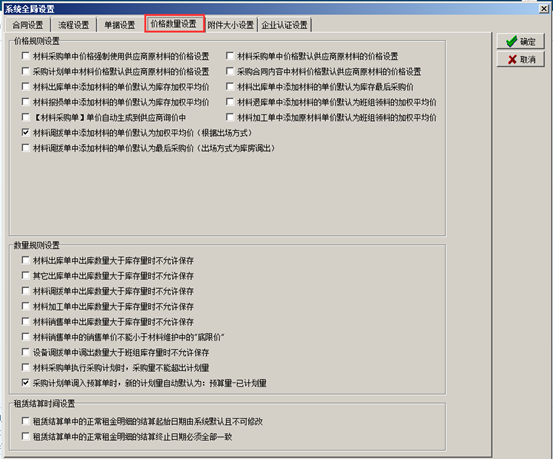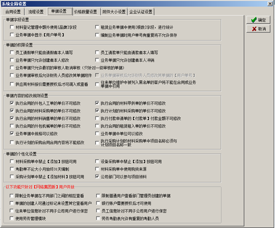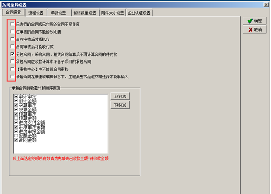 進入系統(tǒng)的“系統(tǒng)維護”-“系統(tǒng)全局設(shè)置”彈出系統(tǒng)全局設(shè)置的對話框,點擊“合同設(shè)置”,在對應(yīng)的復(fù)選框打鉤代表合同受對應(yīng)開關(guān)的控制,如圖: