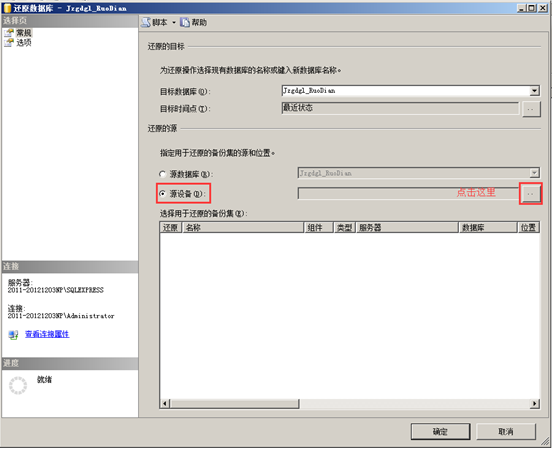 選擇“還原”后進(jìn)入“還原數(shù)據(jù)庫(kù)”窗口,目標(biāo)數(shù)據(jù)庫(kù)默認(rèn)已經(jīng)選擇需要還原的數(shù)據(jù),接著在“還原的源”中的選擇“源設(shè)備(D)”,單擊“源設(shè)備((D)”右邊的“…”按鈕,如圖: