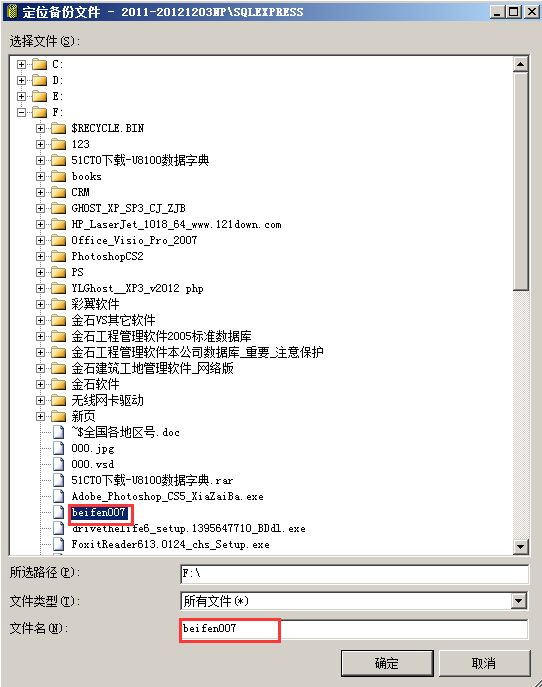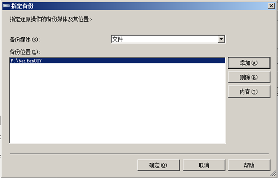 進(jìn)入“指定備份對(duì)話框”,點(diǎn)擊“添加”,進(jìn)入指定數(shù)據(jù)庫(kù)文件窗口,瀏覽并找到需要還原的數(shù)據(jù)庫(kù)備份文件,點(diǎn)擊“確定”, 點(diǎn)擊“確定”后回到指“定備份”對(duì)話框,此時(shí)需要還原的文件已經(jīng)列出來(lái)了,接著點(diǎn)擊“確定”,返回“還原數(shù)據(jù)庫(kù)”。如圖: