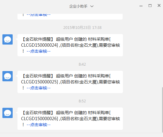 用超級(jí)用戶設(shè)置好微信認(rèn)證之后在,當(dāng)單據(jù)創(chuàng)建人發(fā)起審核后,審核過程中的人都會(huì)收到微信提醒信息。微信如下圖: