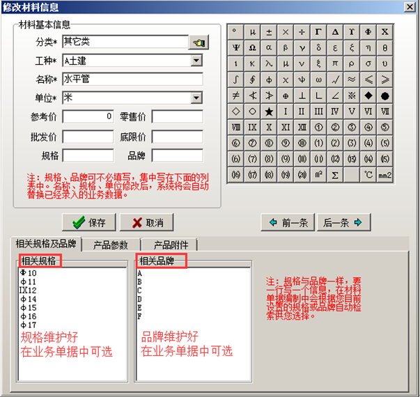 點(diǎn)擊“新增”或“修改”的按鈕來(lái)編輯材料信息,在進(jìn)行材料基本信息編輯時(shí),可進(jìn)行相關(guān)規(guī)格以及相關(guān)品牌的維護(hù),對(duì)應(yīng)的規(guī)格及品牌維護(hù)完成在系統(tǒng)的業(yè)務(wù)單據(jù)中可選,這樣可避免同種材料在系統(tǒng)中生成多條記錄的麻煩。如圖: