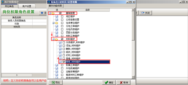 在“系統(tǒng)維護(hù)”-“用戶管理權(quán)限設(shè)置”給具有材料審核權(quán)限的用戶分配權(quán)限,如圖: