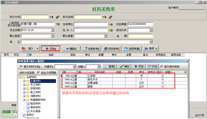 審核通過(guò)的“材料信息”可在系統(tǒng)業(yè)務(wù)單據(jù)中可用,如圖: