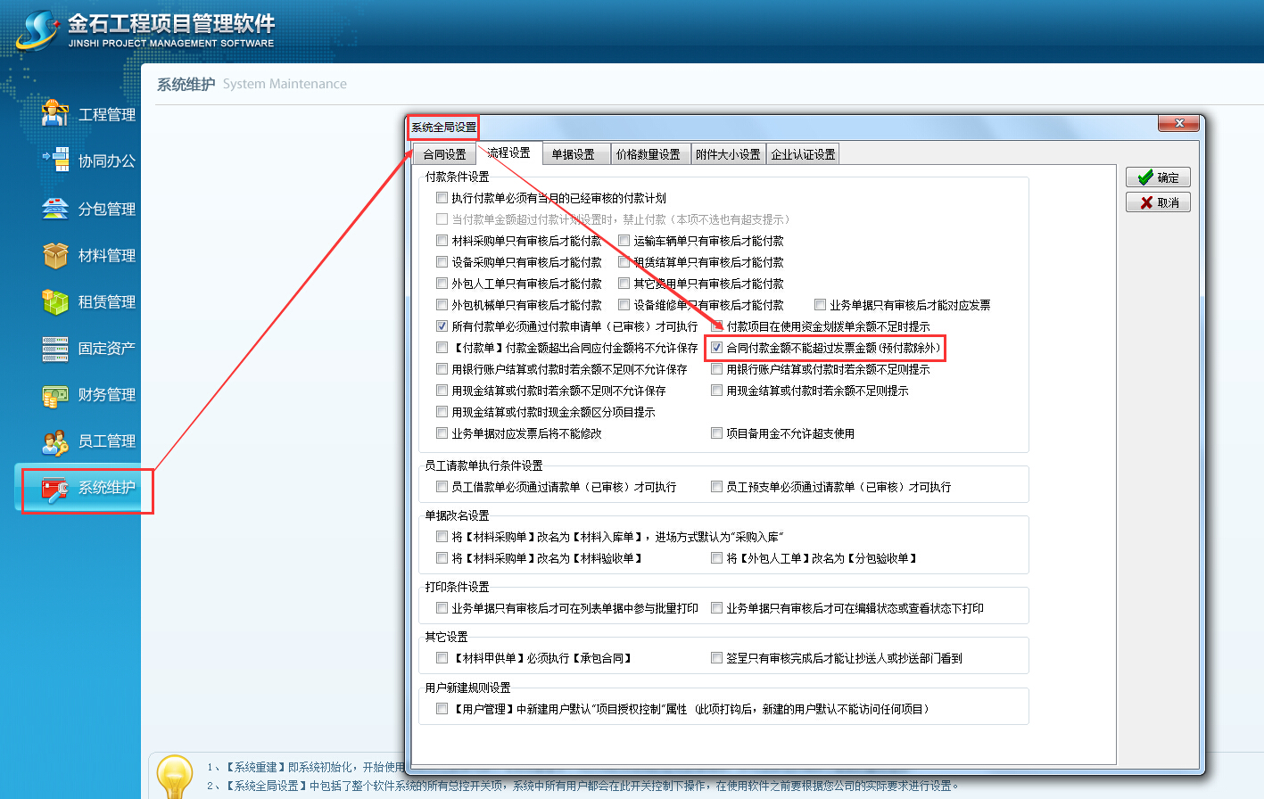 在【系統(tǒng)維護(hù)】-【系統(tǒng)全局設(shè)置】可以設(shè)置合同付款金額不能超過(guò)發(fā)票金額(預(yù)付款除外),如下圖: