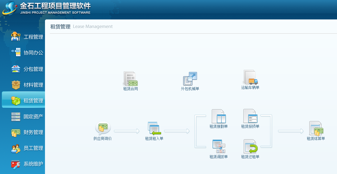 在建筑施工中,材料往往是通過采購或者租賃得來的。所以在建筑材料管理軟件中還要對租賃的材料進行對應的管理。建筑材料管理軟件針對材料租賃過程中的材料租入合同、材料租入、材料租入還租、材料租入報停和材料租賃結算實行一體化流程管理。建筑材料管理軟件中材料租入合同是租賃業(yè)務的指導性文件。合同簽訂之后,租入、歸還、報停的后續(xù)操作都圍繞合同而開展,甚至在進行租入結算時軟件會自動調用租入合同所采用的“日期計算方式”和所擬定的“日租金單價”。