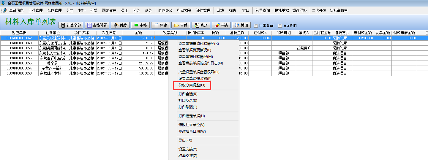 通過工程項(xiàng)目管理軟件價(jià)稅分離后,分離出的稅額可能與實(shí)際的稅額有一定的誤差,可通過選定單據(jù)右鍵選擇稅額調(diào)整,實(shí)現(xiàn)對(duì)稅額的調(diào)整。如下圖: