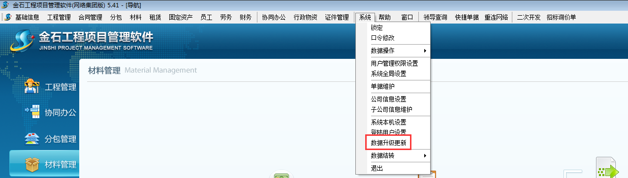 備注:升級(jí)到最新版本后,需要登錄超級(jí)用戶點(diǎn)擊主菜單【系統(tǒng)】-【數(shù)據(jù)升級(jí)更新】。如下圖: