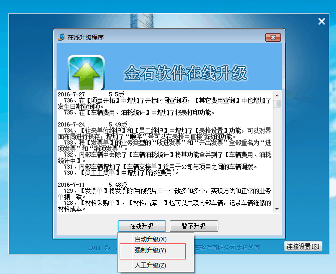 2.雙擊打開金石軟件圖標→連接設(shè)置→在線升級→強制升級