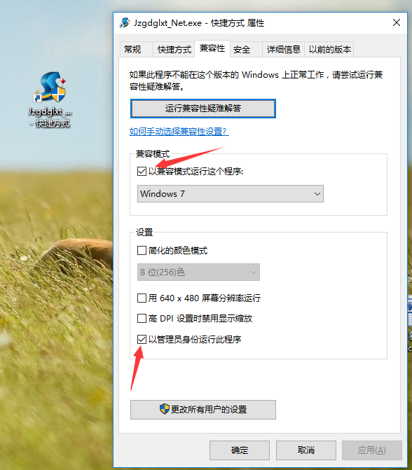 一、選中金石工程項目管理軟件圖標→點鼠標右鍵→兼容性→以管理員身份運行此程序