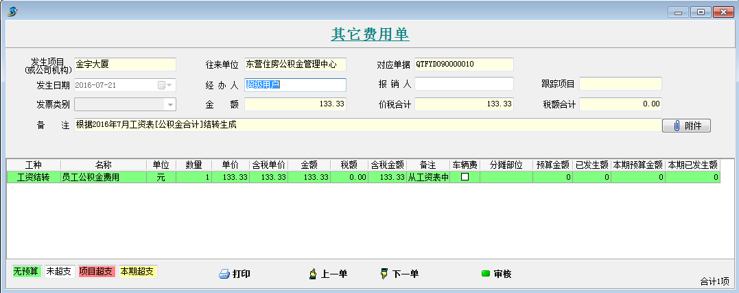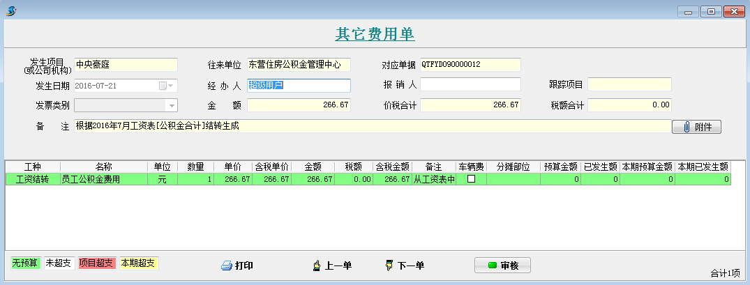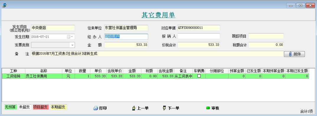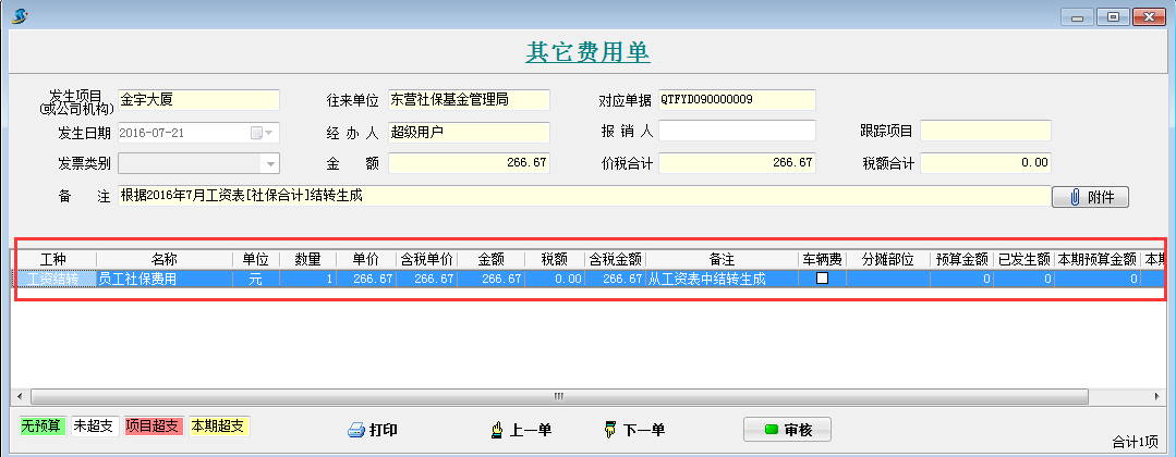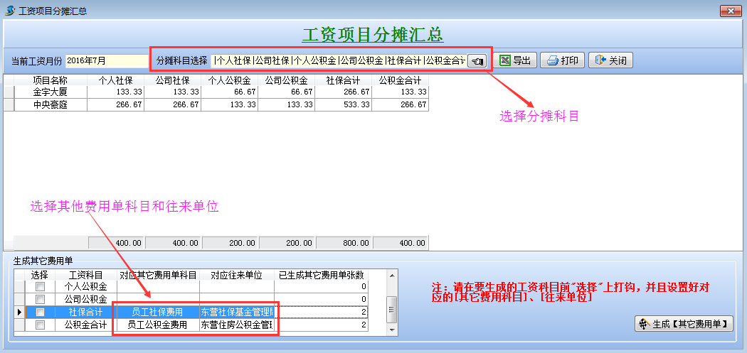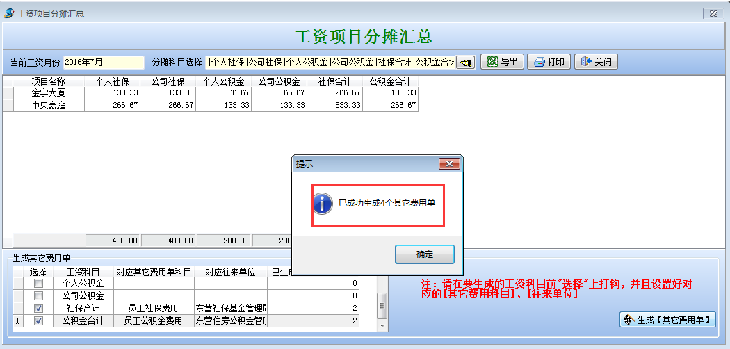 打開(kāi)待攤費(fèi)用模塊,選擇好分?jǐn)偪颇浚斜碇芯蜁?huì)顯示出每個(gè)項(xiàng)目分?jǐn)偪蛻?hù)的明細(xì)。同時(shí)在這個(gè)模塊可以直接生成其它費(fèi)用單,選擇好社保合計(jì)和公積金合計(jì)的對(duì)應(yīng)其它費(fèi)用單科目和對(duì)應(yīng)往來(lái)單位,點(diǎn)擊生成工程項(xiàng)目管理系統(tǒng)【其它費(fèi)用單】,直接可以生成四張其他費(fèi)用單。