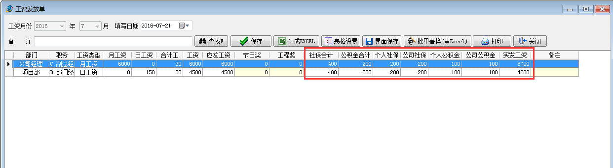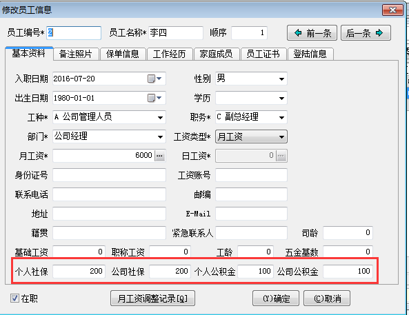 1. 首先在工程項(xiàng)目管理系統(tǒng)員工維護(hù)填寫(xiě)好個(gè)人社保,公司社保,個(gè)人公積金,公司公積金相應(yīng)的金額。如下圖: