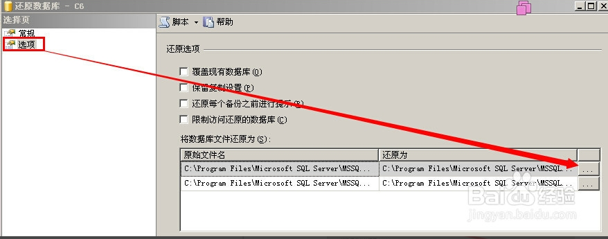 6、彈出還原數(shù)據(jù)庫窗口,在常規(guī)中檢查目標數(shù)據(jù)庫名稱與源數(shù)據(jù)庫名稱是否正確、在選項中找到備份的數(shù)據(jù)庫文件