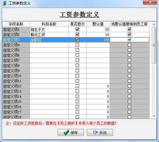 填寫科目名稱和默認(rèn)值,是否顯示打勾,是否將默認(rèn)值替換到員工庫(kù)