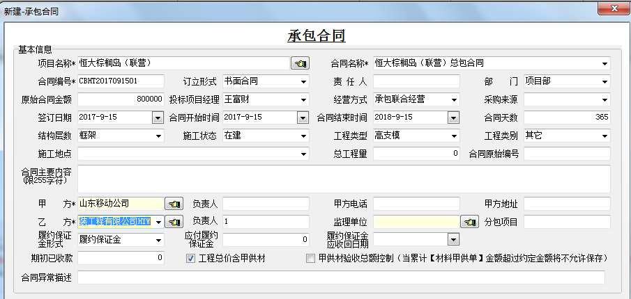 ①在“恒大棕櫚島(聯(lián)營)”項(xiàng)目下創(chuàng)建“承包合同”、“分包合同”等